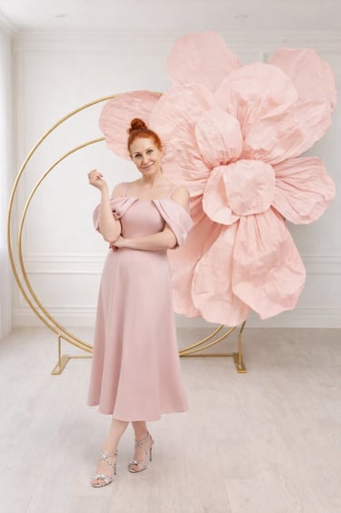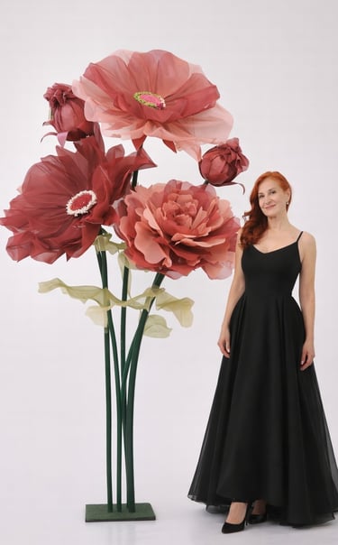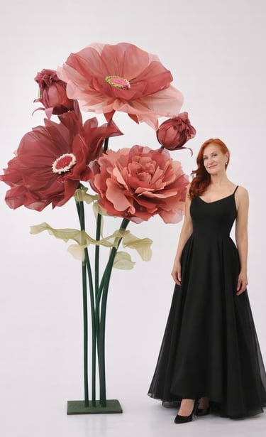 This signature setup features five oversized handcrafted flowers made from voile fabric, designed to create a soft, elegant and eye-catching statement. The lightweight fabric gives the flowers a delicate, airy look that feels refined and luxurious.